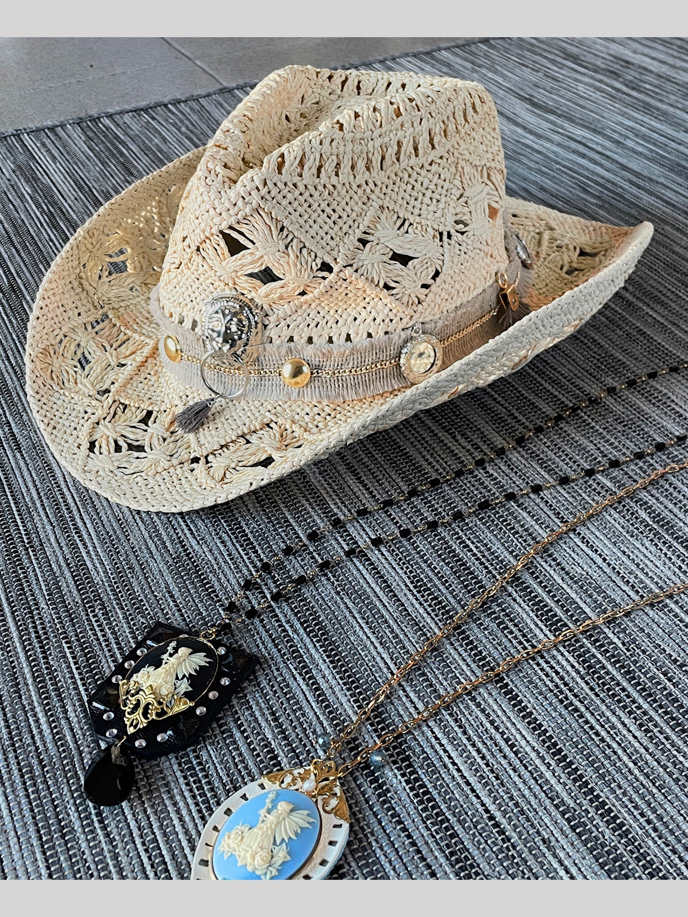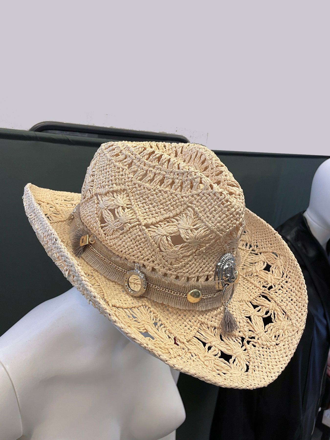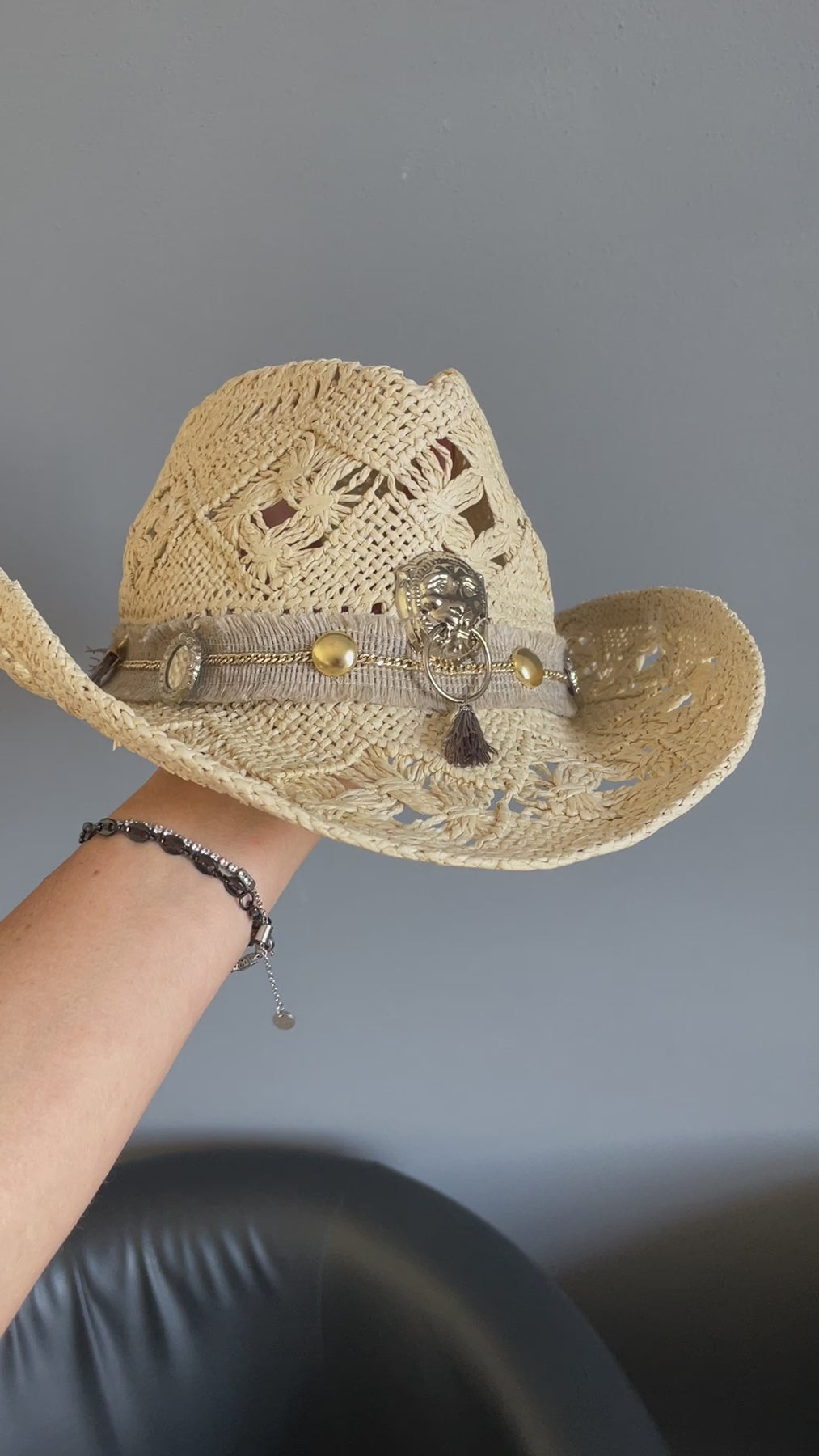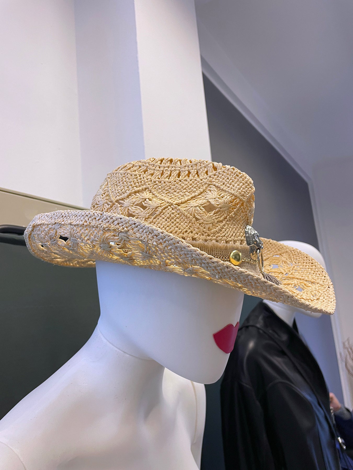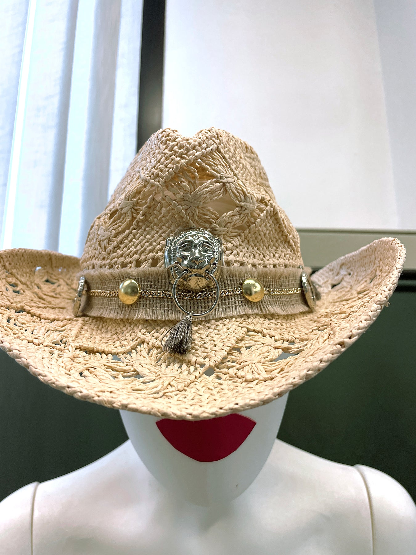 Prezzo regolare €75,00 Risparmia €-75,00Cappello in paglia chiara colore naturale intrecciata a mano effetto pizzo, stile boho-tex, lavorato con applicazioni di passamaneria a frangetta e catena dorata, piccoli specchietti, rivetti e nappine in cotone. Questo tipo di modello dona a qualsiasi forma di viso, molto leggero e portabile in tutte le occasioni è perfetto in abbinamento ad abitino leggero estivo e ad una delle nostre coffe-borse in palma nana intrecciata per un outfit easy e personale.