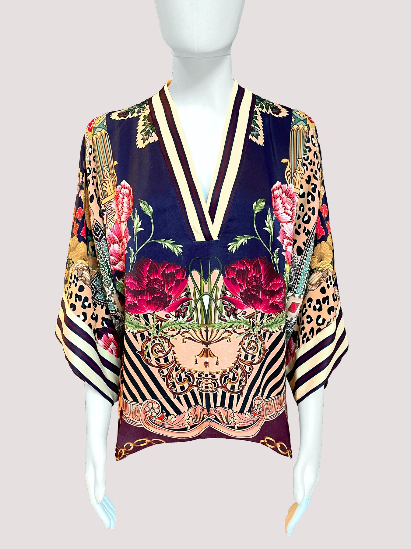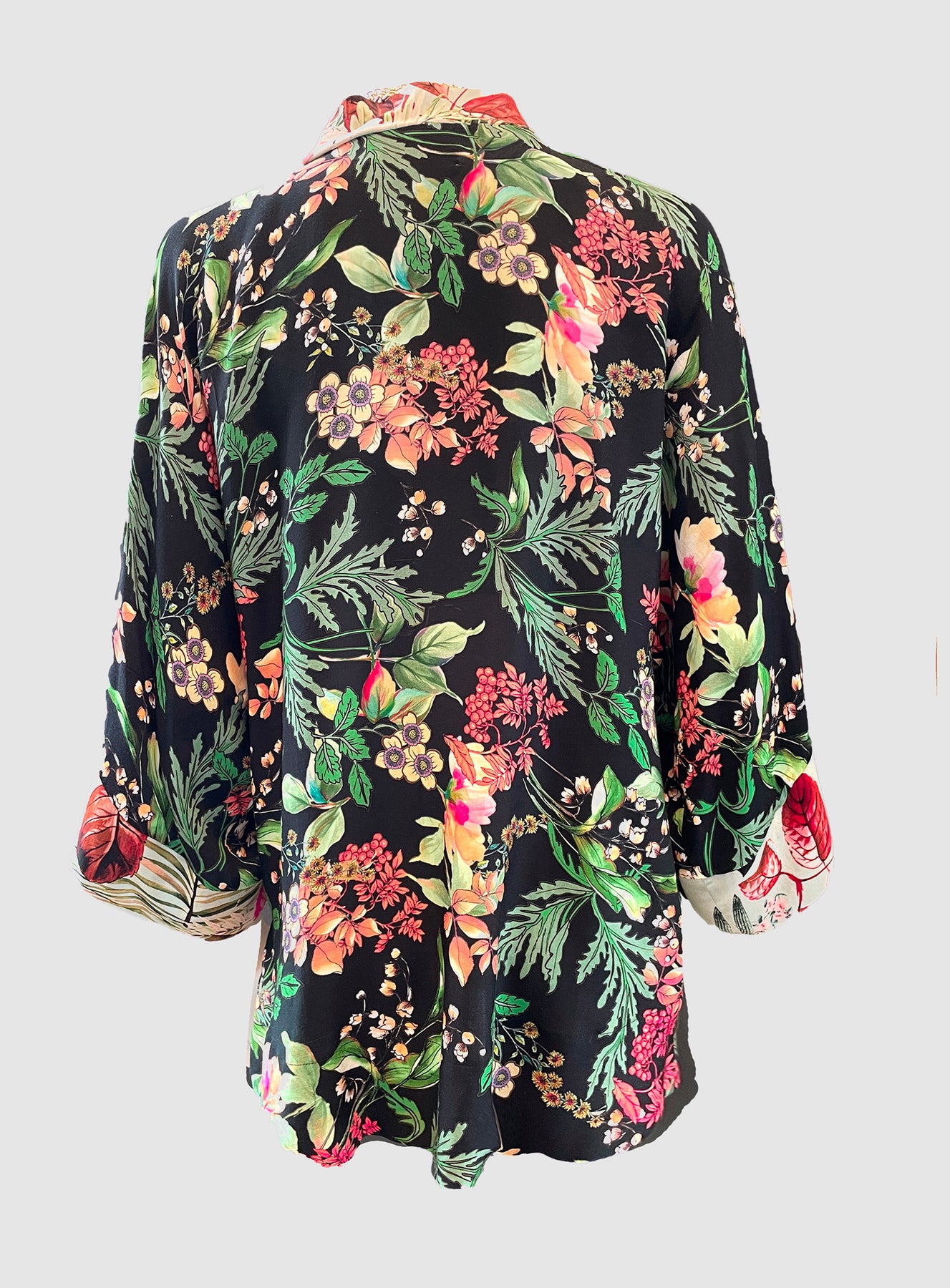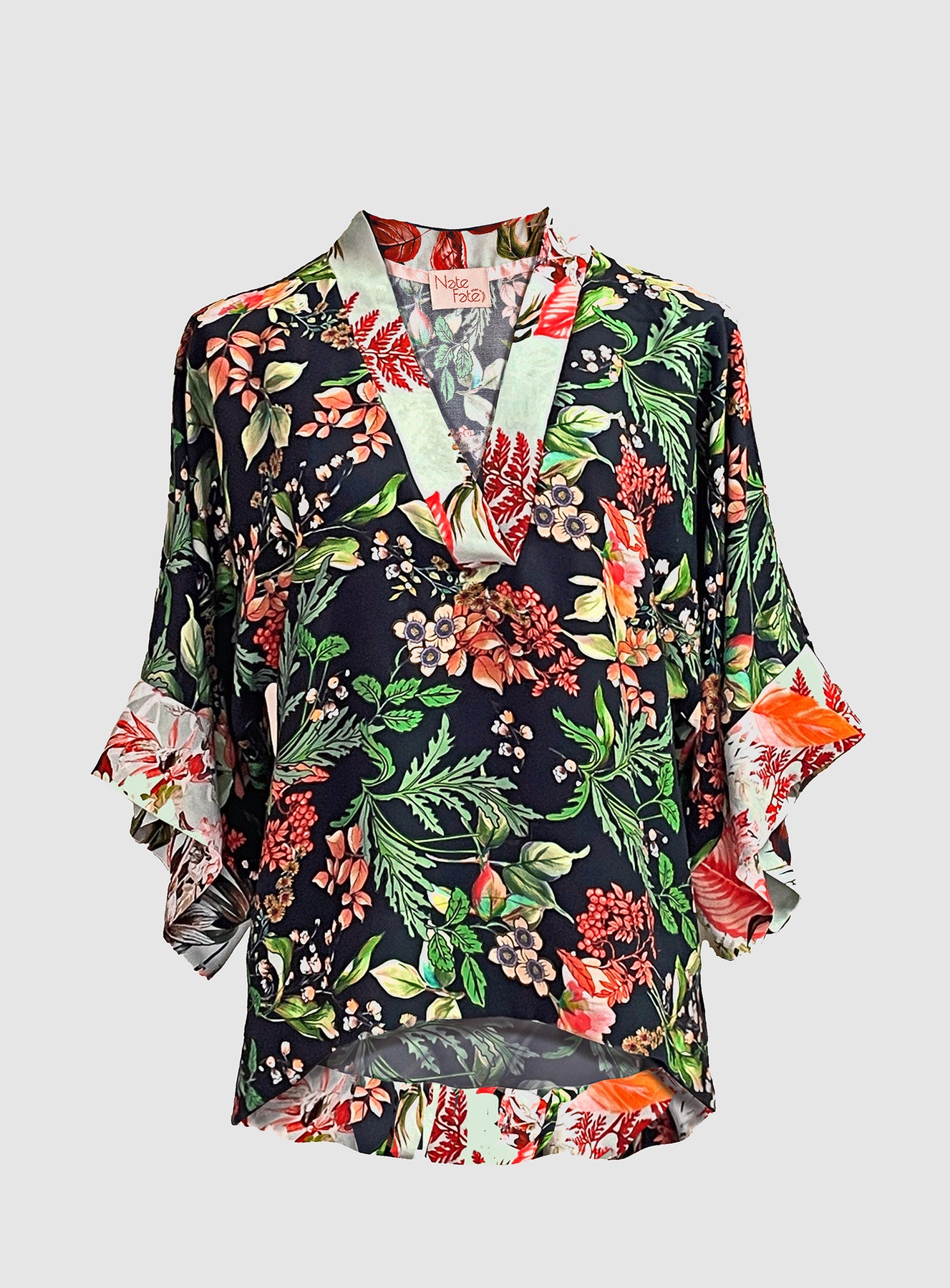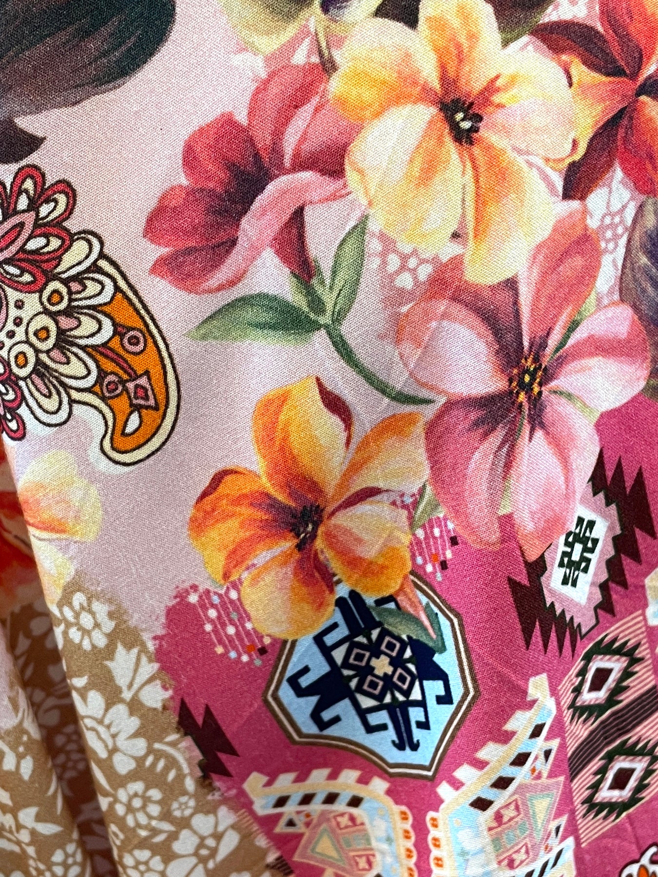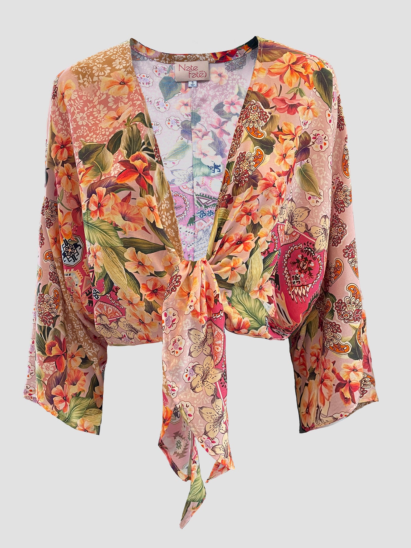 La casacca Meraviglia nei toni del rosa ed arancio con stampa unica ed esclusiva per Nate Fate, è in raso di peso medio di viscosa naturale, il modello ha la linea fluida e scivolata addosso, comfort ma non ampia con maniche taglio Kimono e l'orlo stondato leggermente più lungo nel dietro. I bordi dello scollo e delle maniche sono in tinta unita arancio per creare un contrasto originale e raffinato. Questo capo si può indossare in maniera casual con dei jeans o un ampio pantalone in colore unito o come lo proponiamo noi abbinato al suo pantalone con la stessa fantasia per un outfit chic e sofisticato che con tacchi alti e pochette diventa perfetto per le cerimonie ed occasioni importanti!