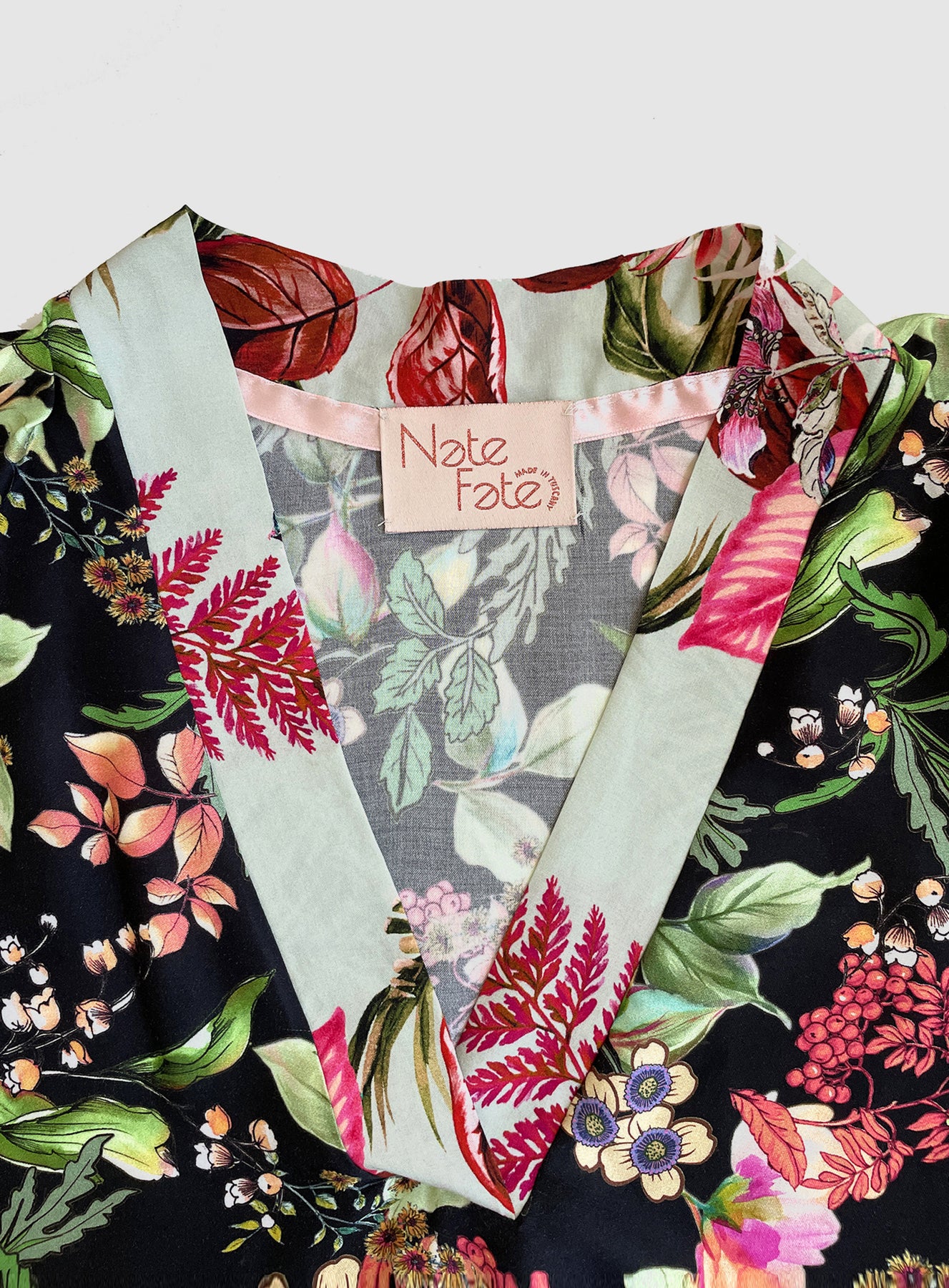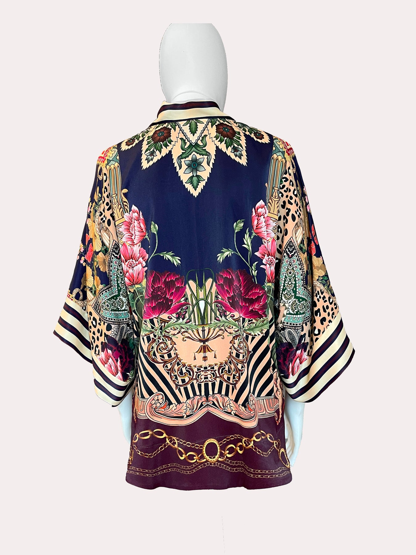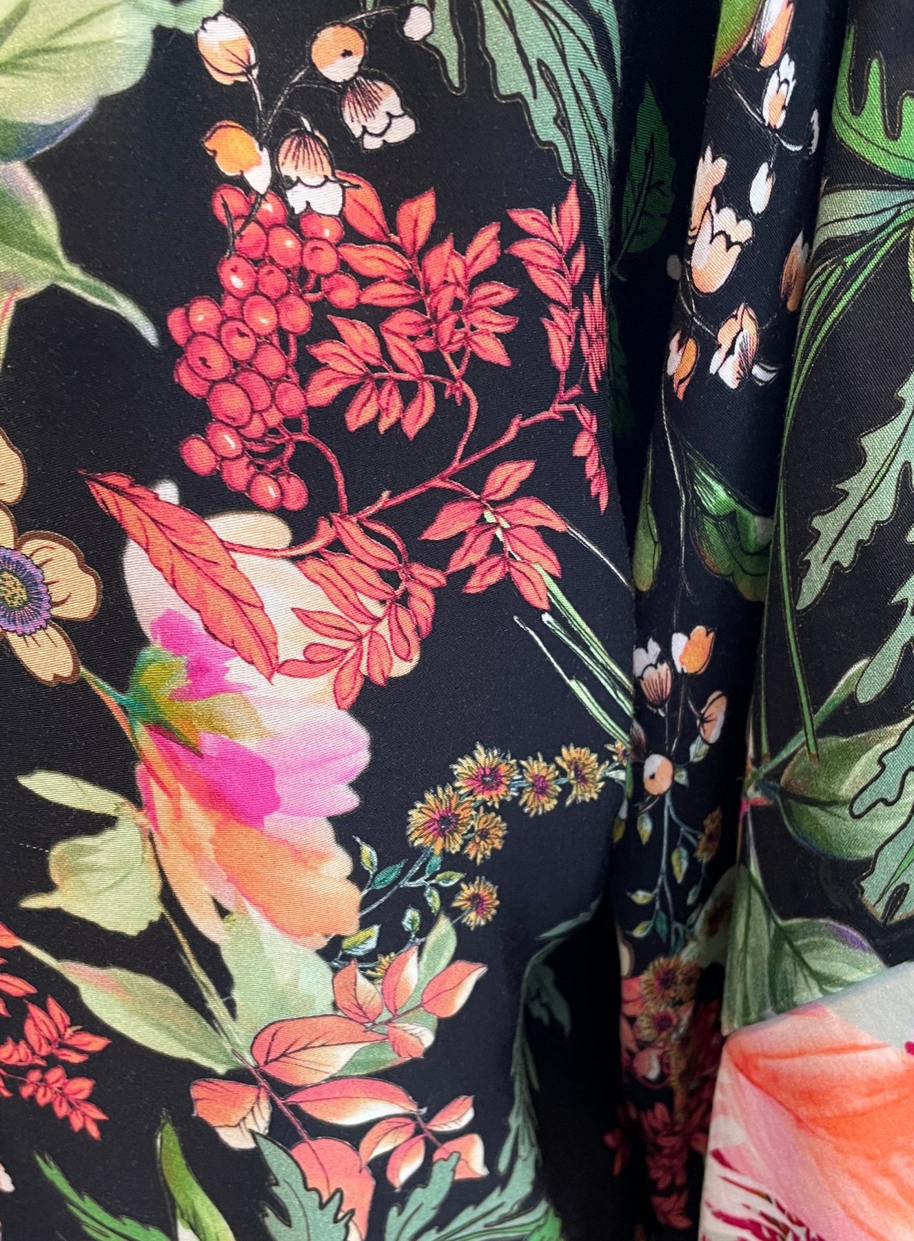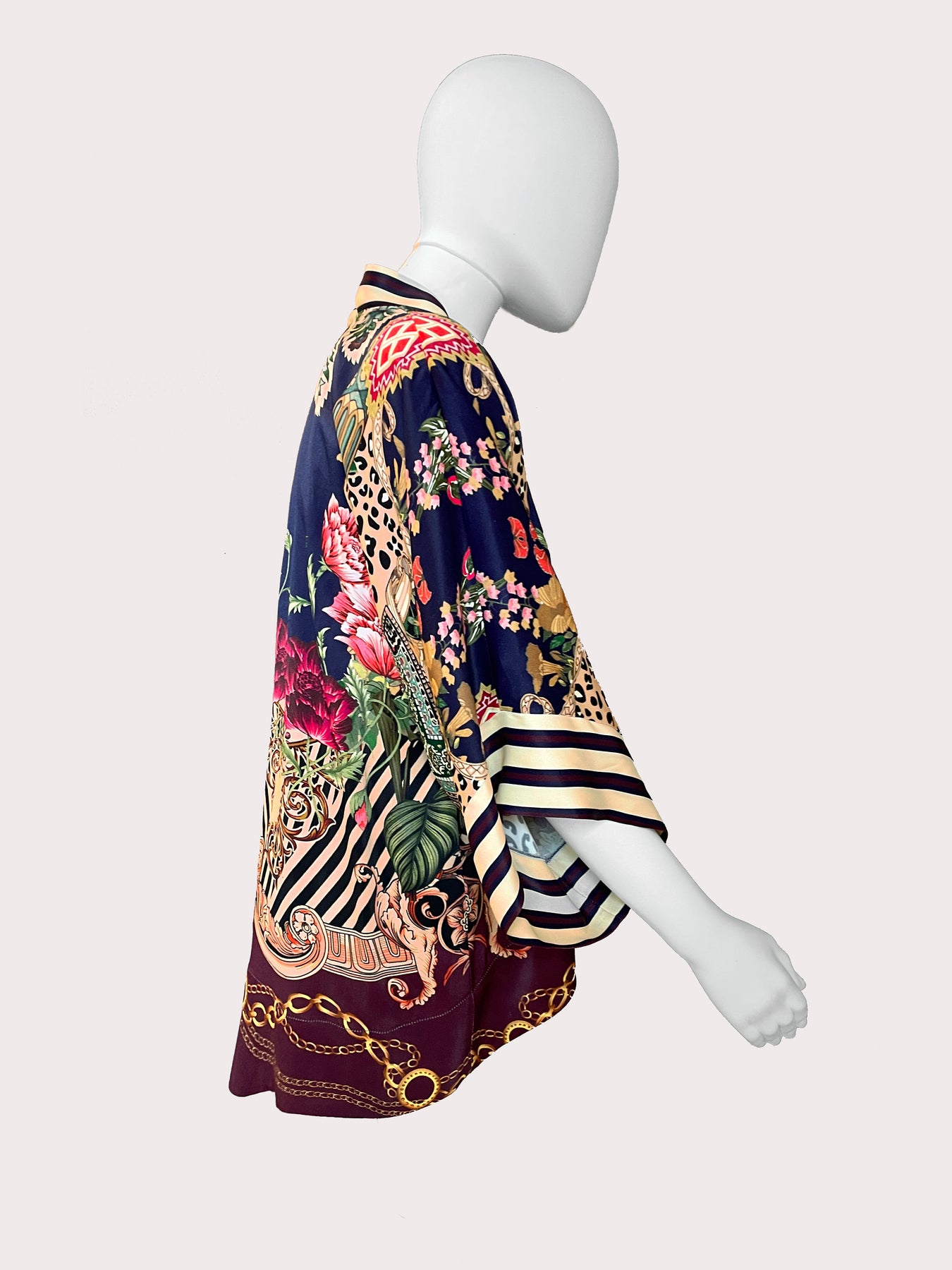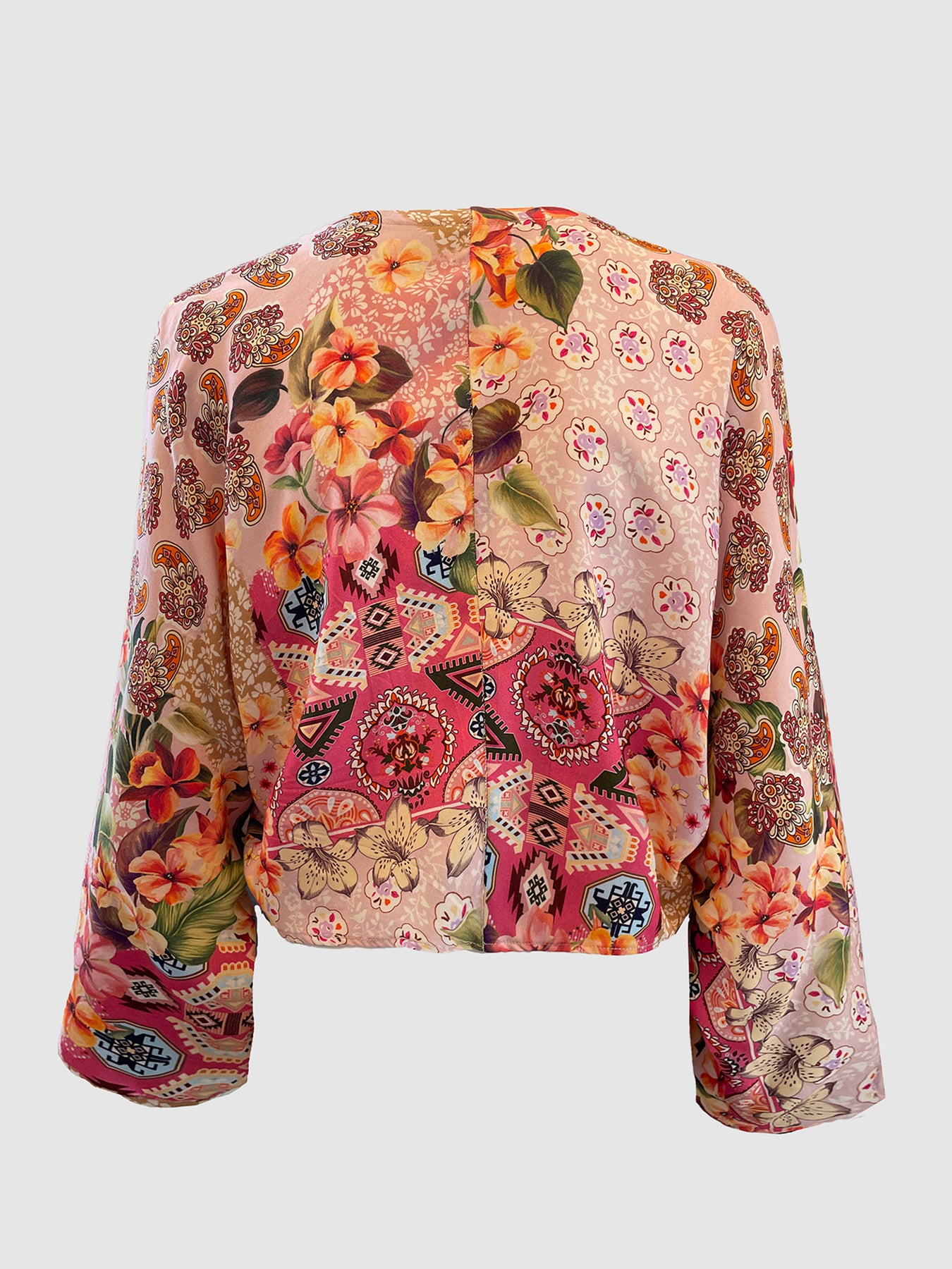 La casacca Meraviglia nei toni del rosa ed arancio con stampa unica ed esclusiva per Nate Fate, è in raso di peso medio di viscosa naturale, il modello ha la linea fluida e scivolata addosso, comfort ma non ampia con maniche taglio Kimono e l'orlo stondato leggermente più lungo nel dietro. I bordi dello scollo e delle maniche sono in tinta unita arancio per creare un contrasto originale e raffinato. Questo capo si può indossare in maniera casual con dei jeans o un ampio pantalone in colore unito o come lo proponiamo noi abbinato al suo pantalone con la stessa fantasia per un outfit chic e sofisticato che con tacchi alti e pochette diventa perfetto per le cerimonie ed occasioni importanti!