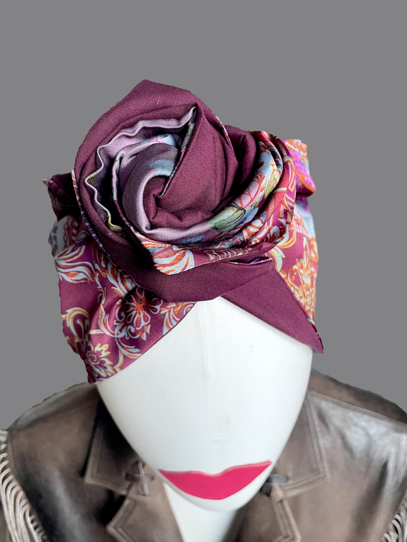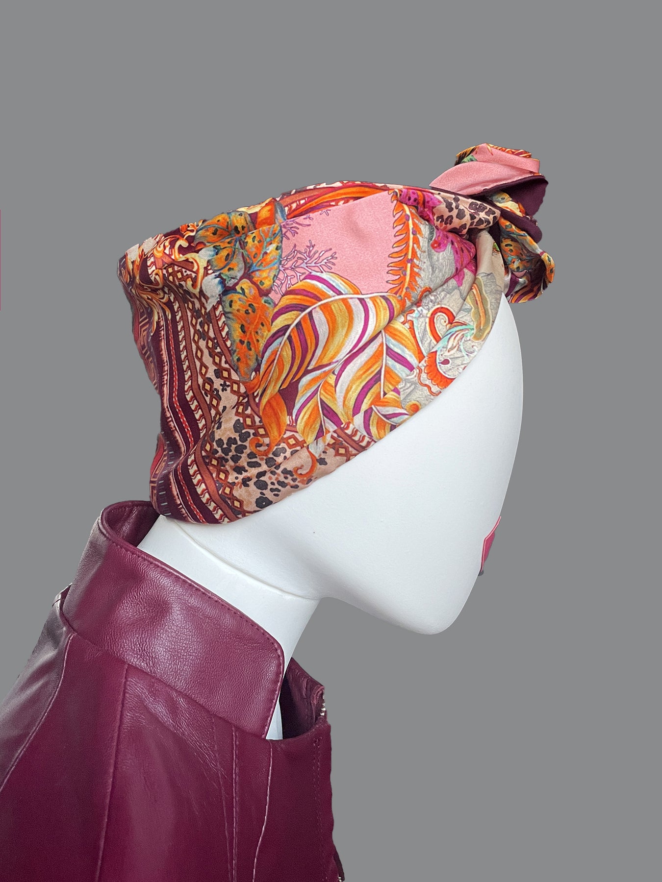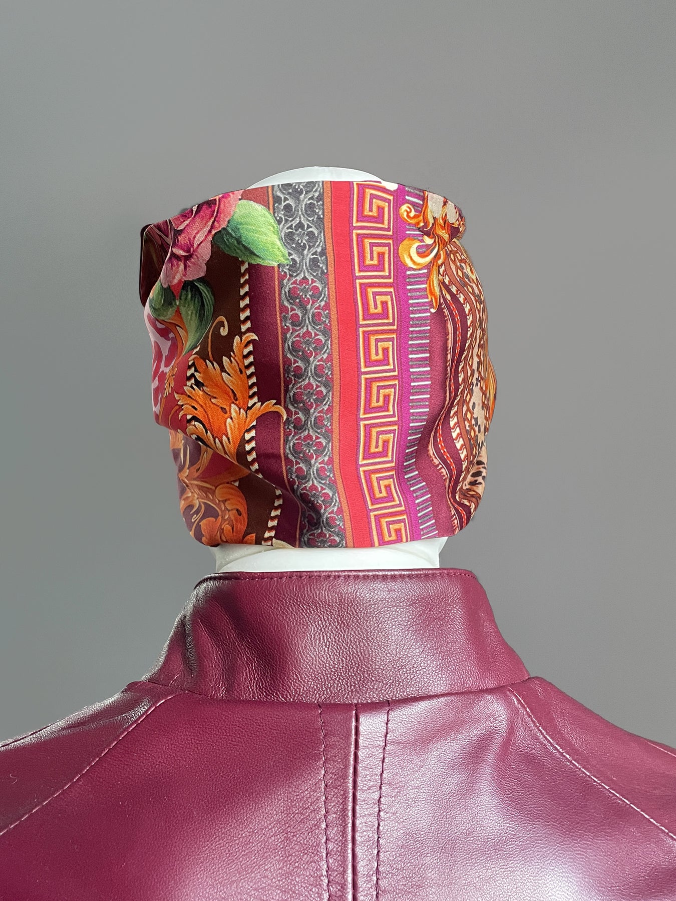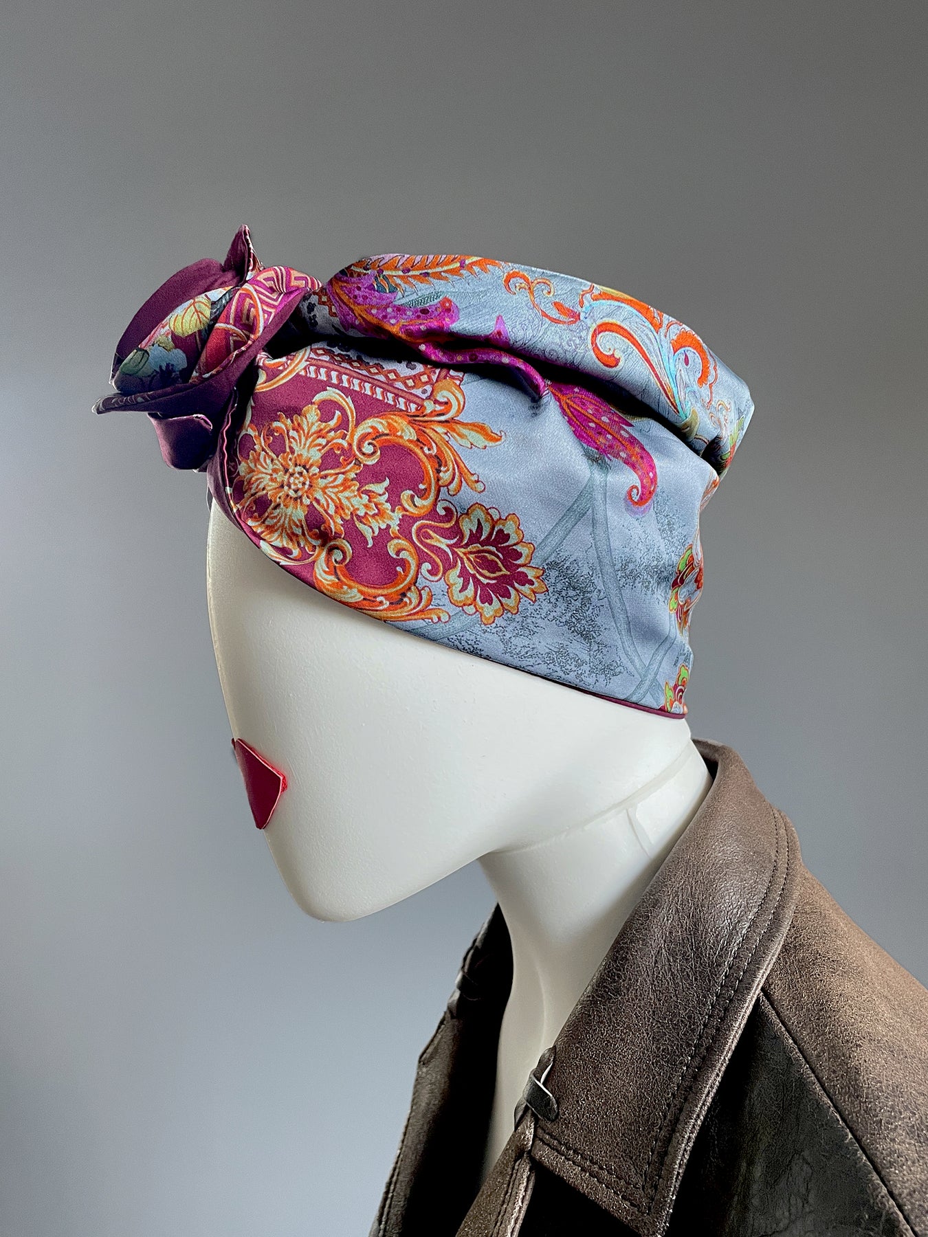 Alta fascia per capelli che crea un look affascinante ed esotico! Double face ha due lati diversi: uno jacquard con disegno geometrico nero, grigio, bianco e beige e l'altro in jersey di viscosa nero, nella parte alta ha un filo modellabile per creare con i lembi varie forme, si può indossare da entrambi i lati in maniera divertente e sbarazzina oppure chic e sofisticata! Impossibile da ignorare!!