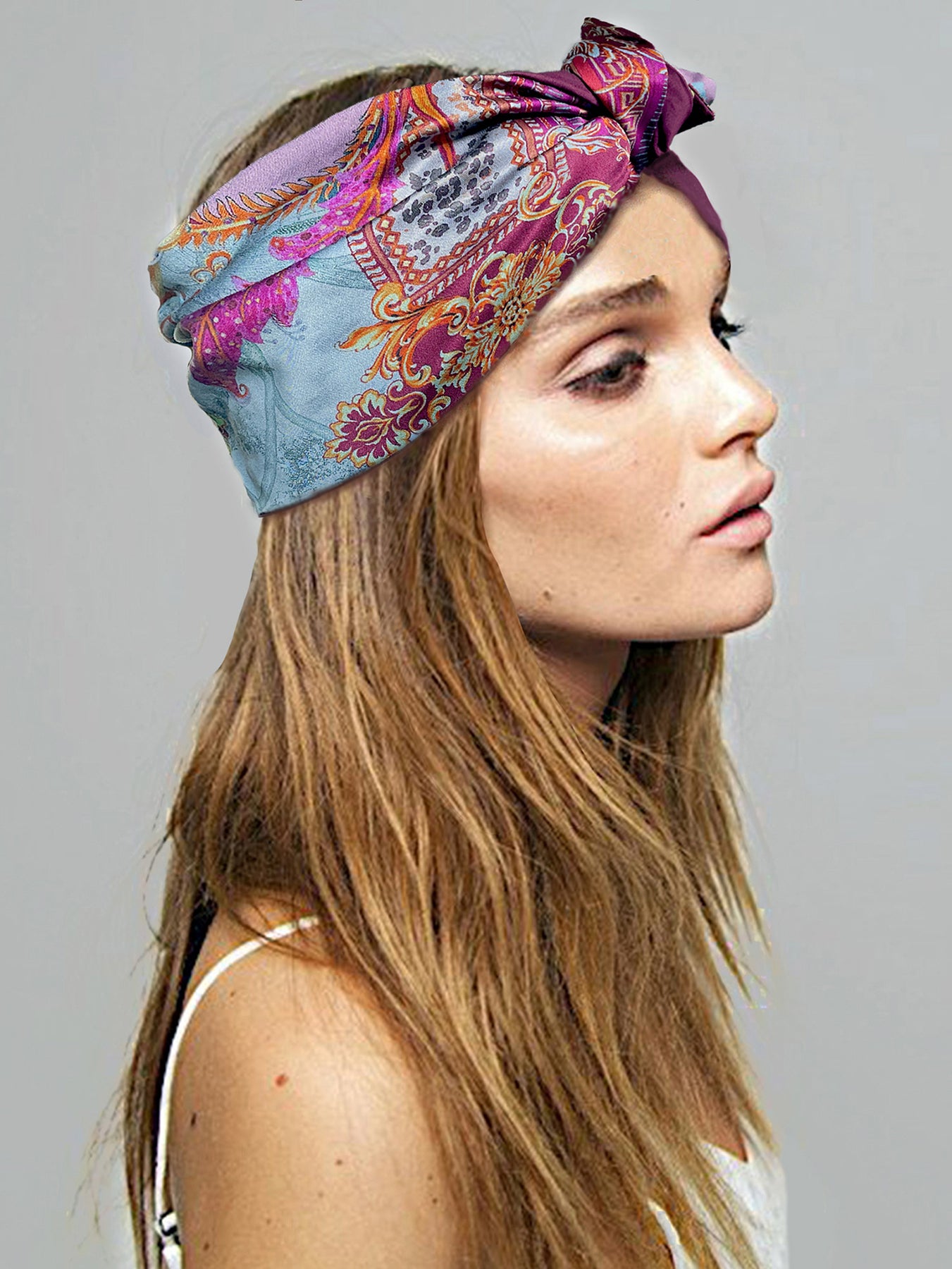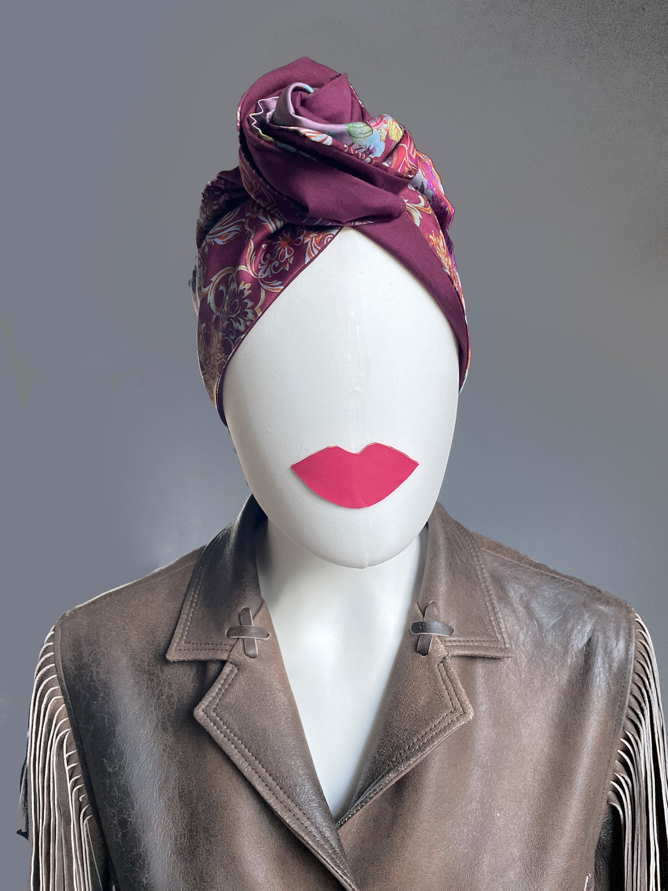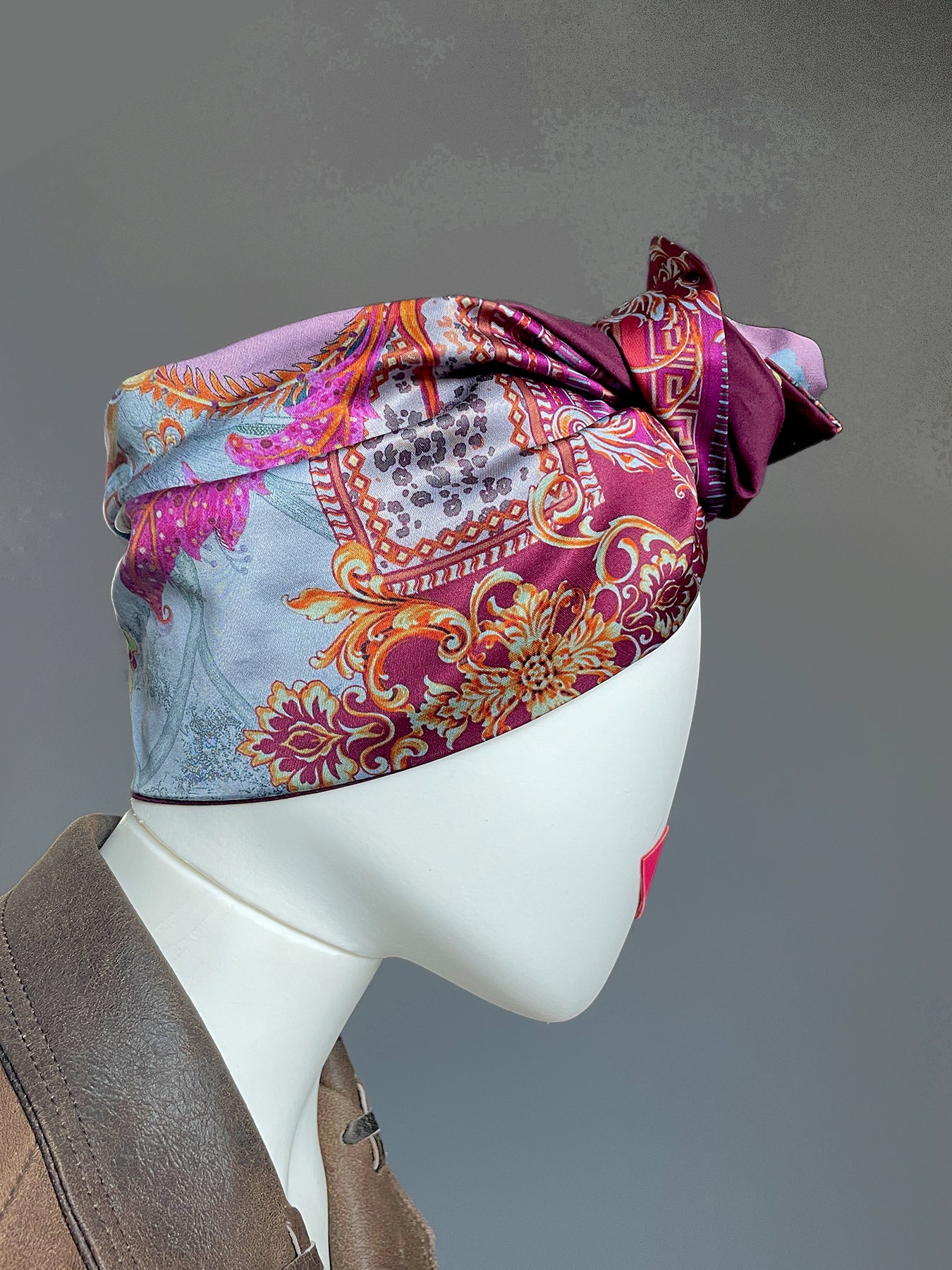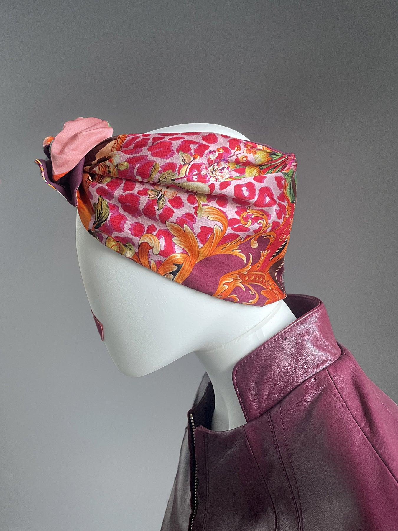 Alta fascia per capelli che crea un look affascinante ed esotico! Double face ha due lati diversi: uno jacquard con disegno geometrico nero, grigio, bianco e beige e l'altro in jersey di viscosa nero, nella parte alta ha un filo modellabile per creare con i lembi varie forme, si può indossare da entrambi i lati in maniera divertente e sbarazzina oppure chic e sofisticata! Impossibile da ignorare!!