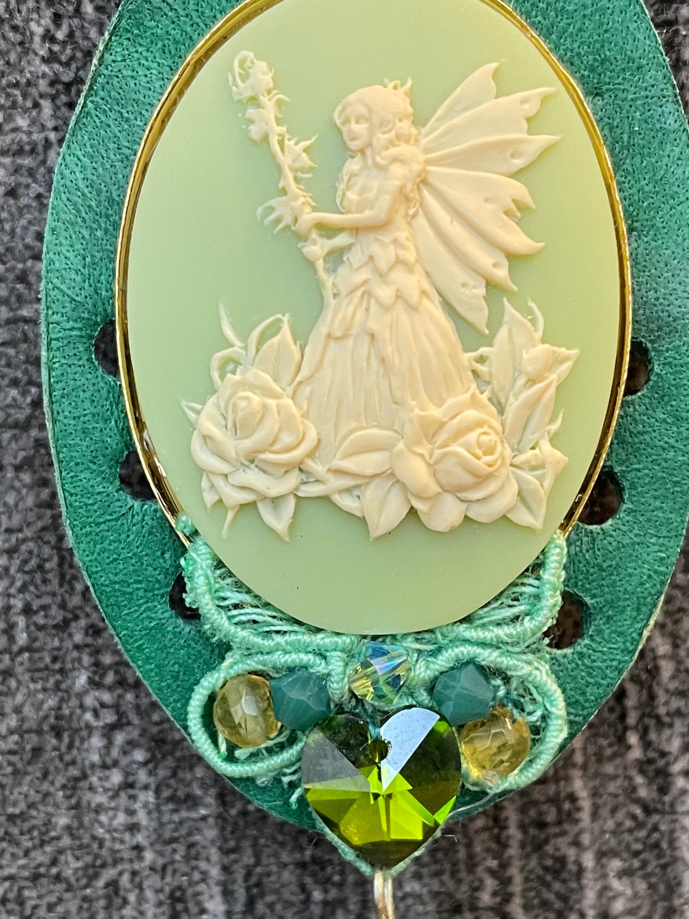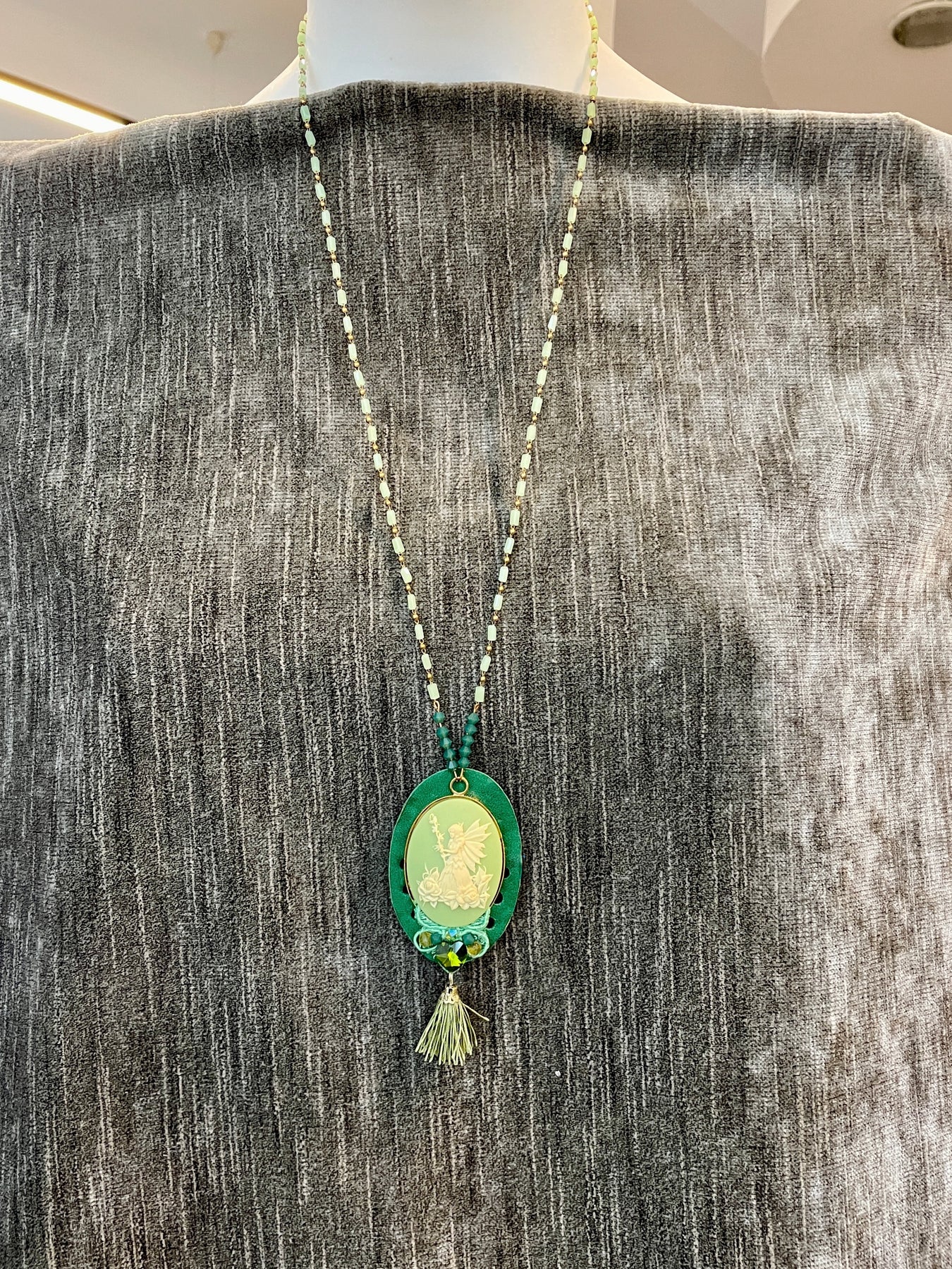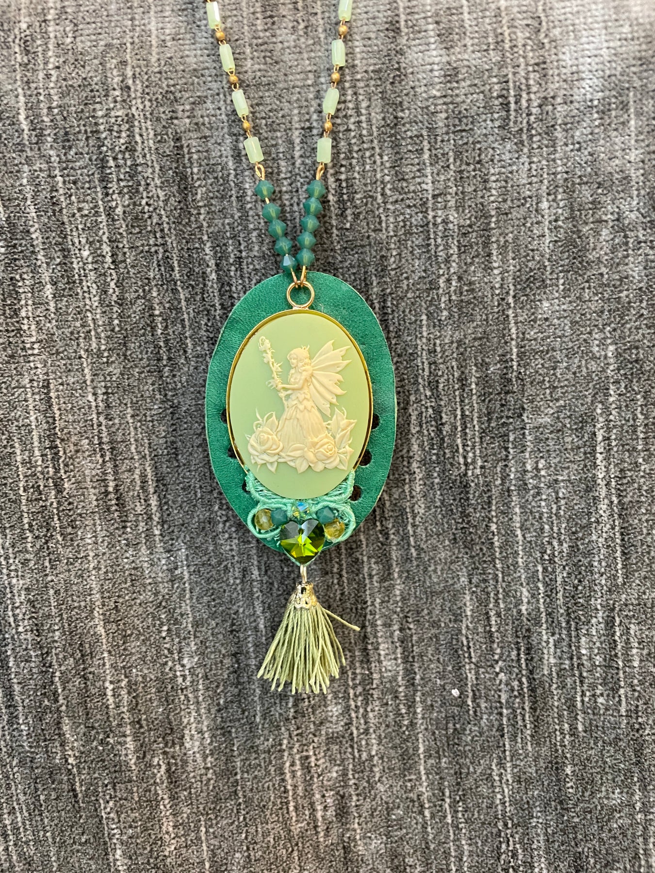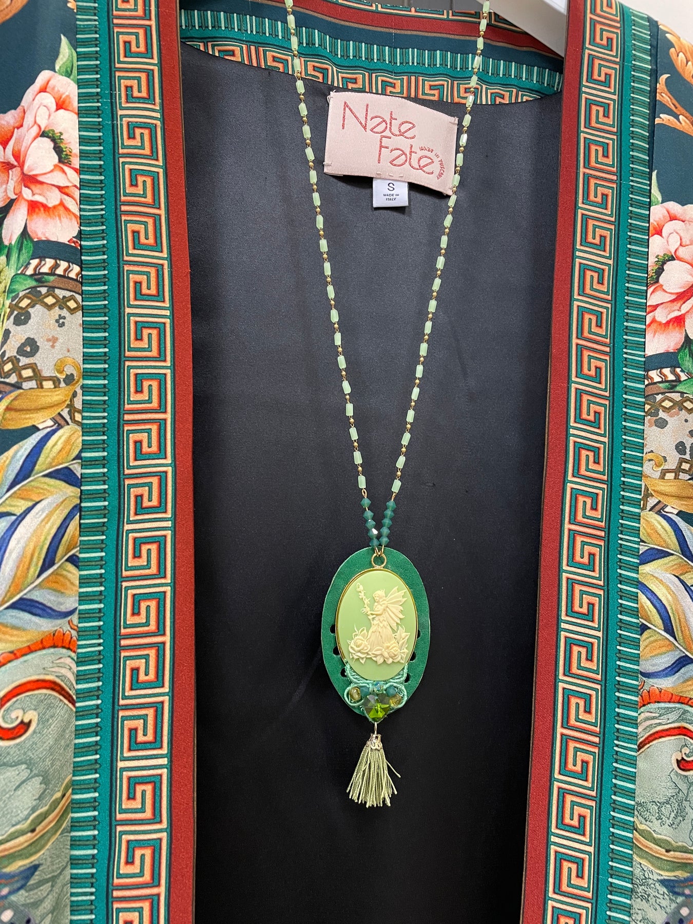 Il gioiello cammeo verde è completamente realizzato a mano con materiali preziosi, ha l'ovale in vera pelle color verde intenso ed il cammeo in scalatura di colore verde più chiaro esaltato da un ricciolo di pizxo in tinta ed un cuoricino Swarovski verde. Il pendente è formato da una nappa di passamaneria color verde salvia e la catena e formata da piccoli cristalli rettangolari verde giada. Il centrale in resina rappresenta una fatina simbolo del nostro brand!  Portabile in ogni occasione, questo accessorio da un tocco romantico e molto glamour, noi lo proponiamo indossato sul nostro kimono lungo. Per Tutte le donne NATE FATE che sanno fare piccole e grandi magie quotidiane!