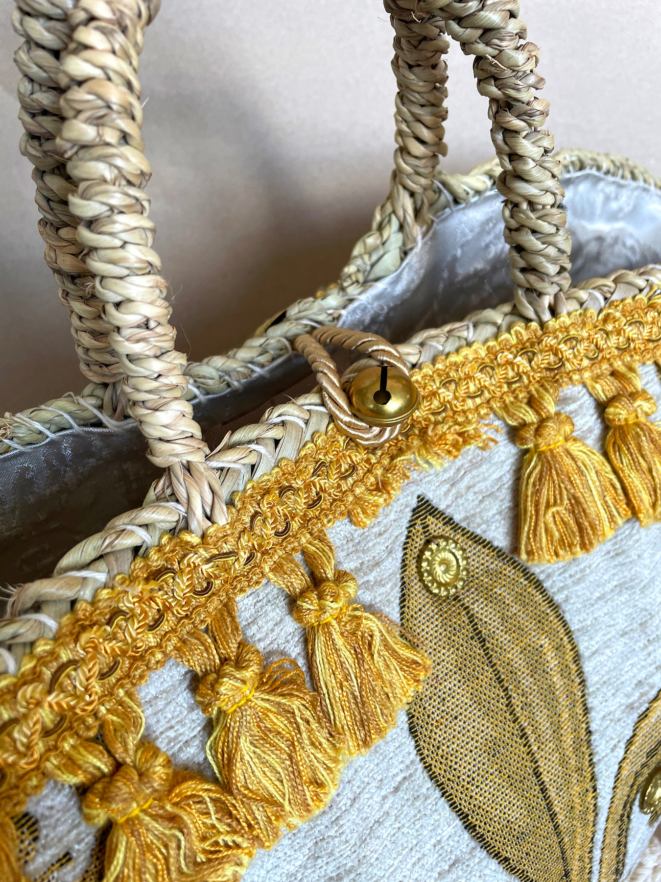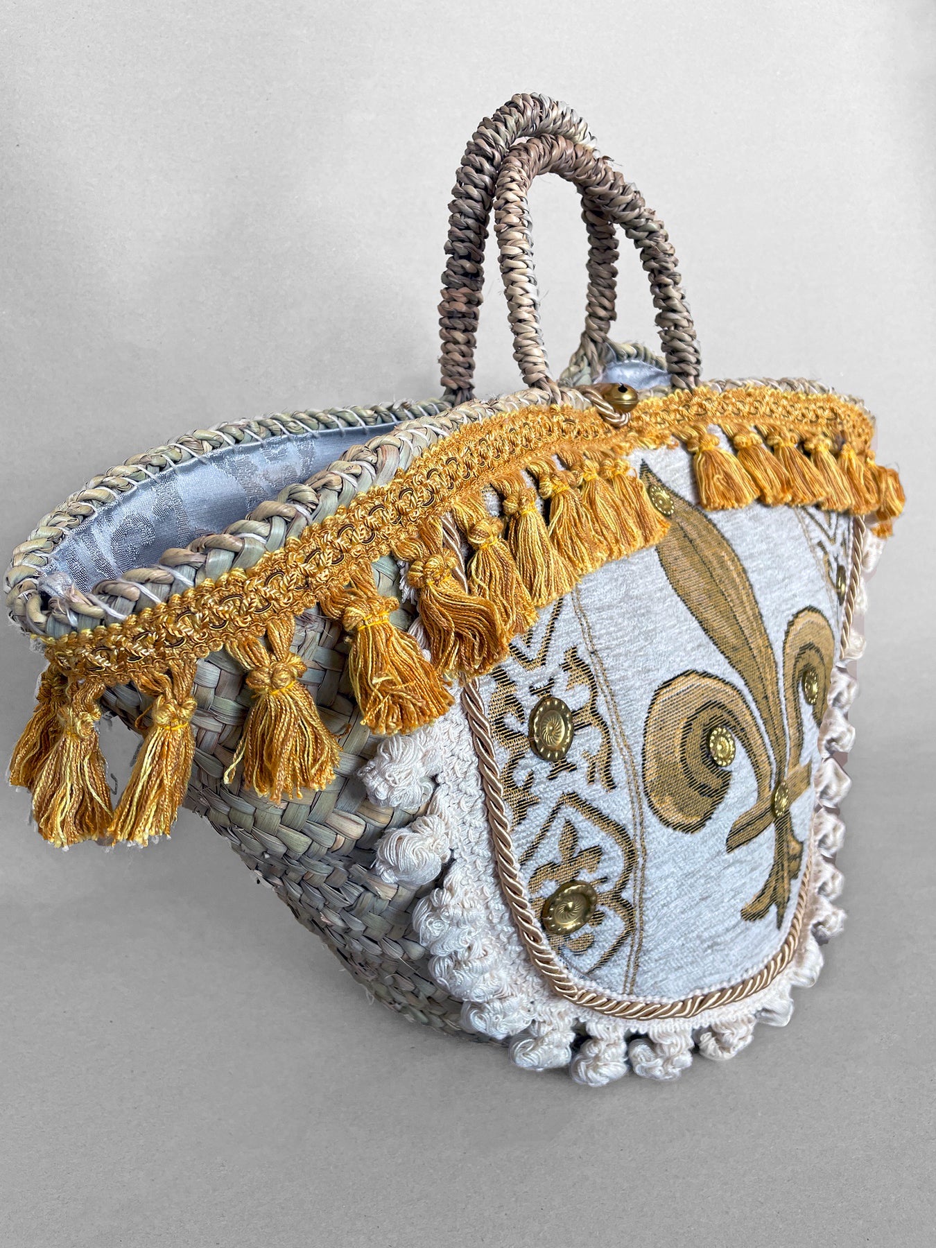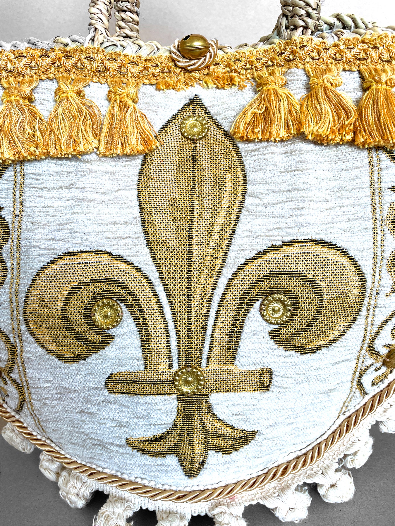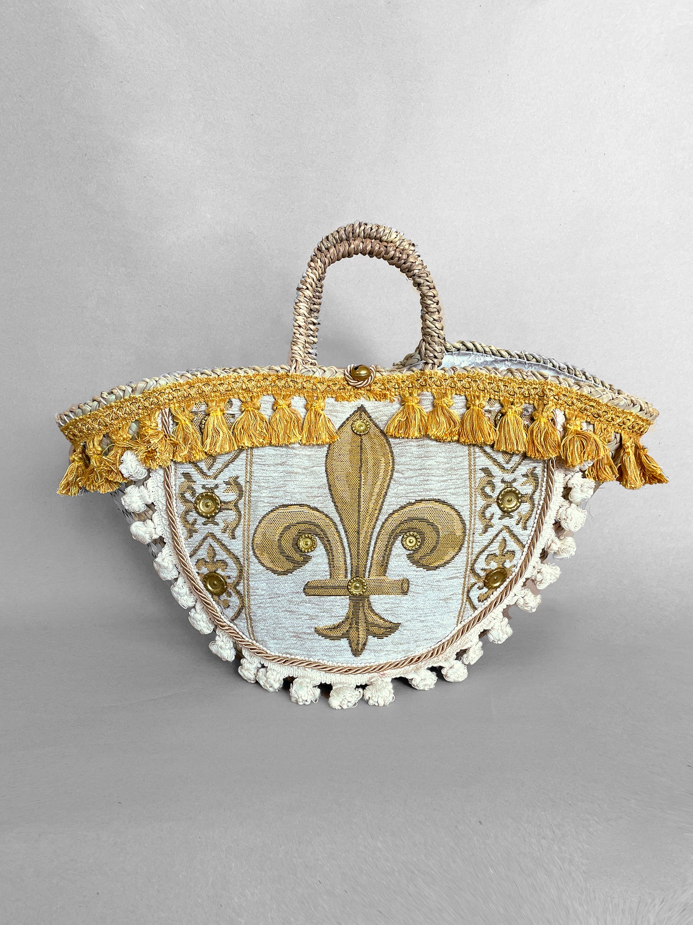 Grande coffa con l'elegante stemma del giglio fiorentino su tessuto jacquard di cotone fiammato con colori bianco panna, giallo e beige. Il davanti con linea a mezzaluna è contornato da passamaneria a cipolline bianco panna con cordoncino beige, il giglio giallo oro centrale è arricchito da rosette in metallo oro antico e nel profilo alto della borsa un ricco nastro di passamaneria a nappine giallo oro. In tipico stile di antica tessitura Fiorentina questa borsa vuole essere un omaggio alla nostra meravigliosa città di Firenze. La parte dietro di questa importante coffa presenta una composizione con un leoncino dorato centrale dal quale prosegue una nappa a fili oro e giallo paglierino. La fodera interna è in un bel tessuto damascato pesante bianco panna unito. La chiusura è formata dal classico cordoncino e campanellino dorato. Pensatela in giro per la città o sulla spiaggia con ogni tipo di outfit dalla mattina alla sera .. è una daily- bag perfetta per tutte le occasioni!