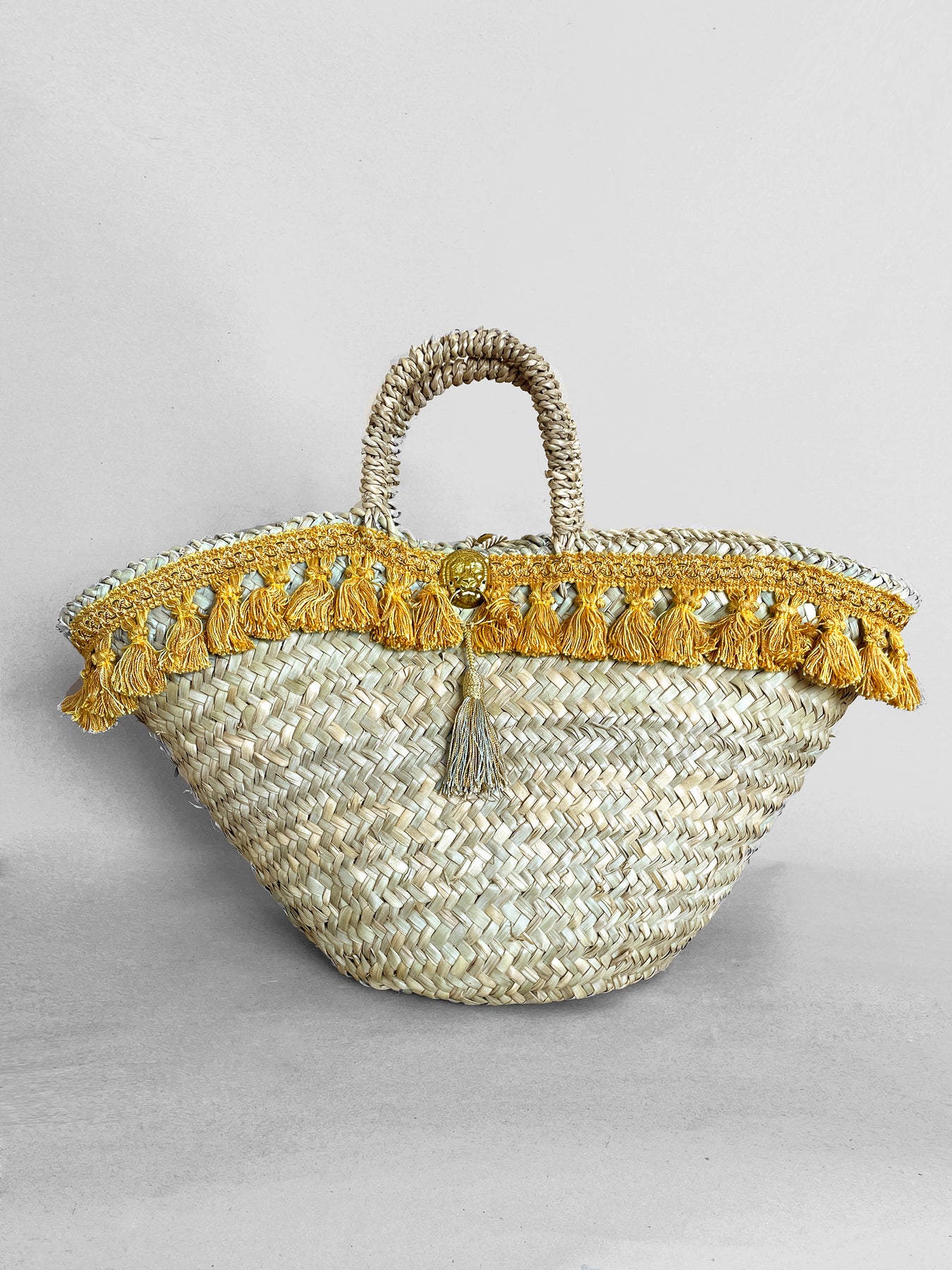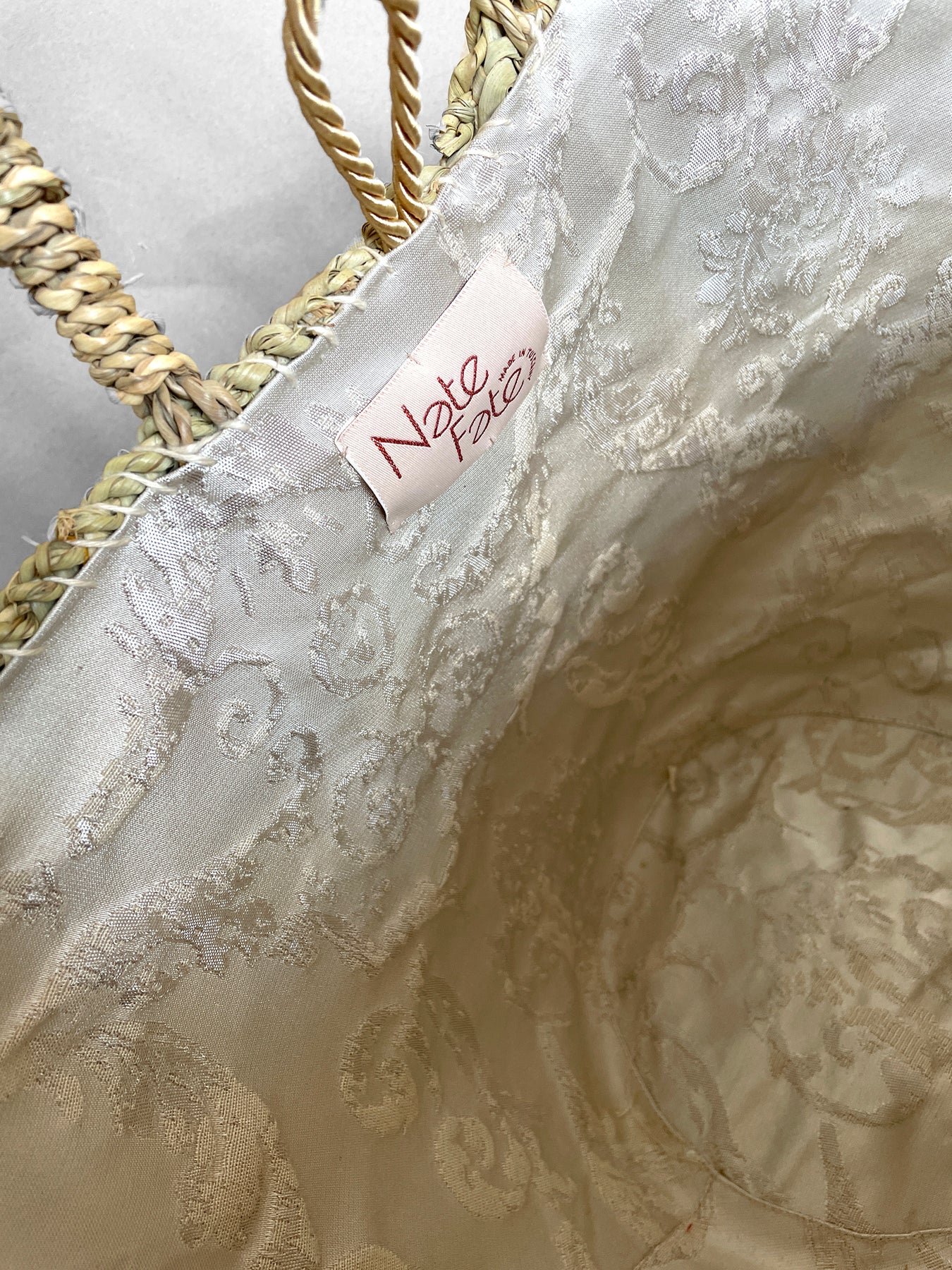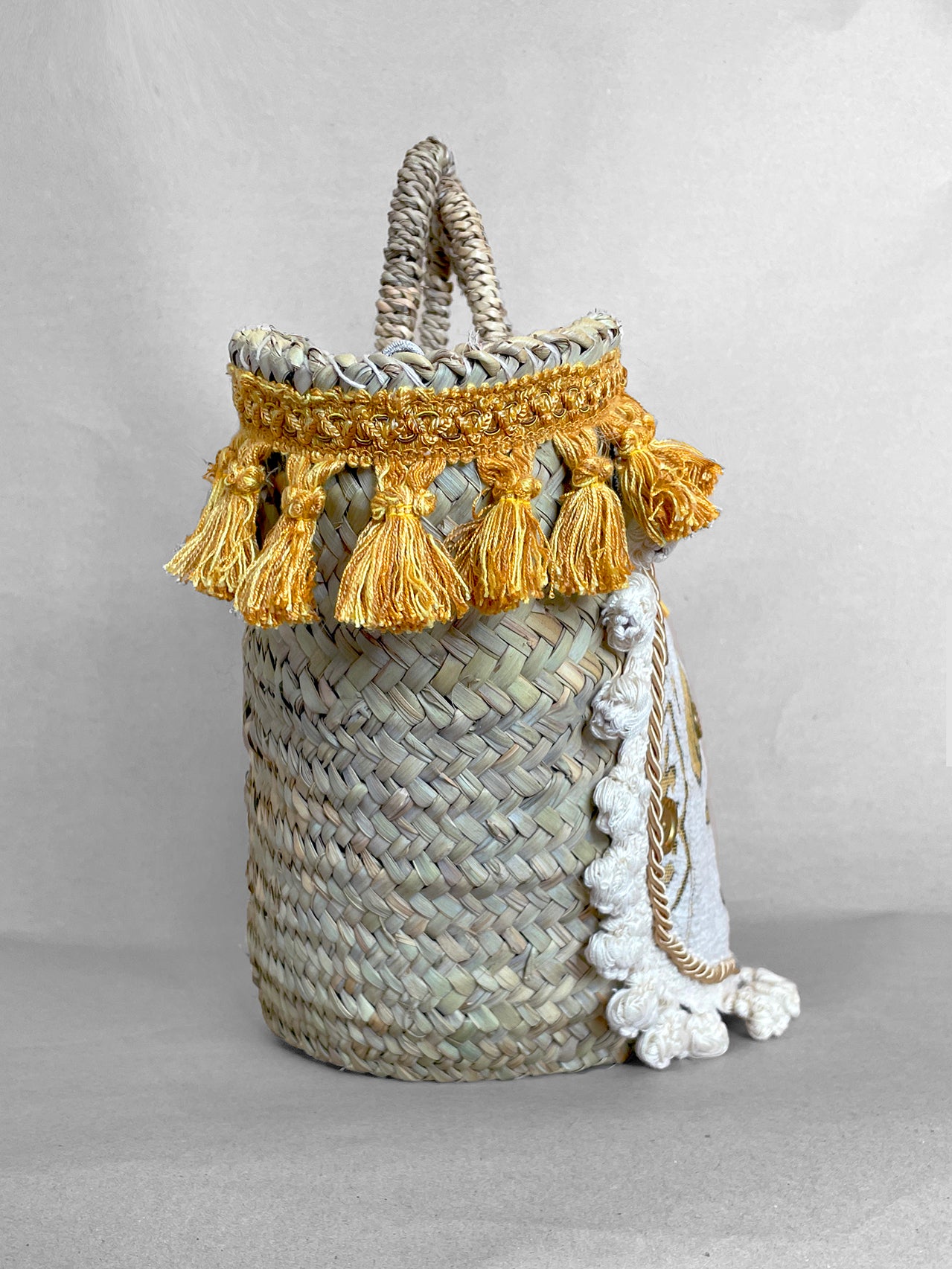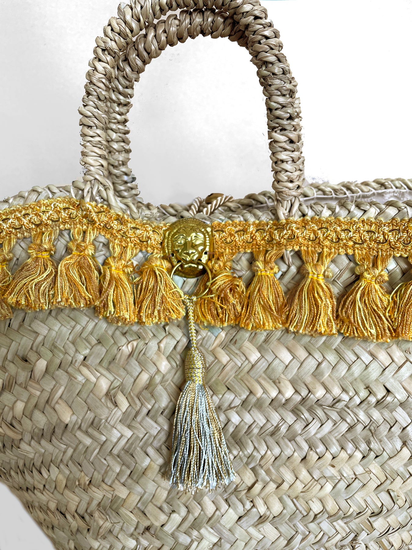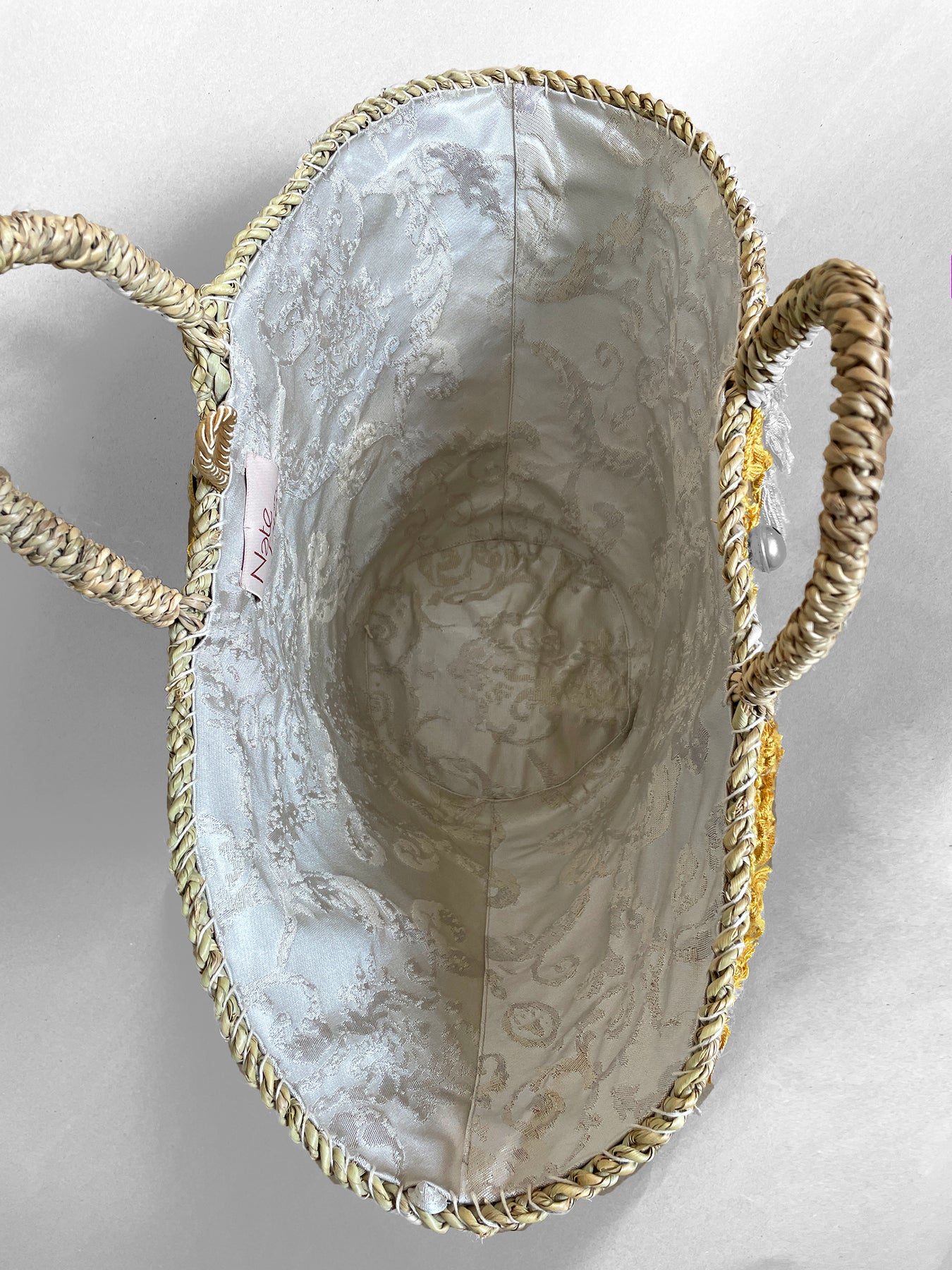 Grande coffa con l'elegante stemma del giglio fiorentino su tessuto jacquard di cotone fiammato con colori bianco panna, giallo e beige. Il davanti con linea a mezzaluna è contornato da passamaneria a cipolline bianco panna con cordoncino beige, il giglio giallo oro centrale è arricchito da rosette in metallo oro antico e nel profilo alto della borsa un ricco nastro di passamaneria a nappine giallo oro. In tipico stile di antica tessitura Fiorentina questa borsa vuole essere un omaggio alla nostra meravigliosa città di Firenze. La parte dietro di questa importante coffa presenta una composizione con un leoncino dorato centrale dal quale prosegue una nappa a fili oro e giallo paglierino. La fodera interna è in un bel tessuto damascato pesante bianco panna unito. La chiusura è formata dal classico cordoncino e campanellino dorato. Pensatela in giro per la città o sulla spiaggia con ogni tipo di outfit dalla mattina alla sera .. è una daily- bag perfetta per tutte le occasioni!